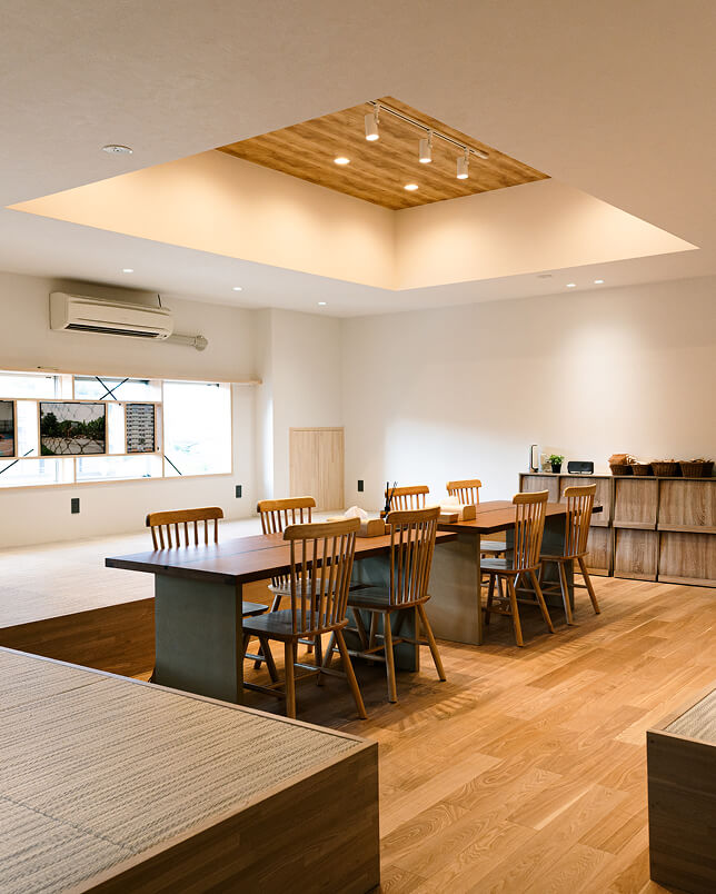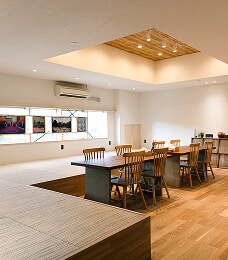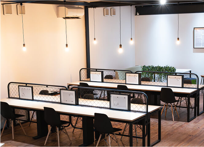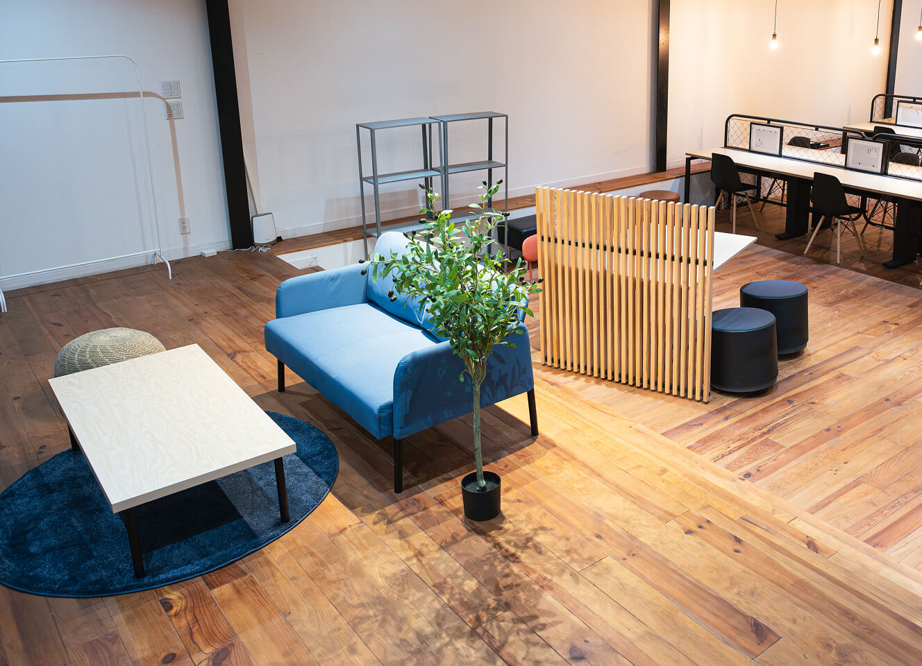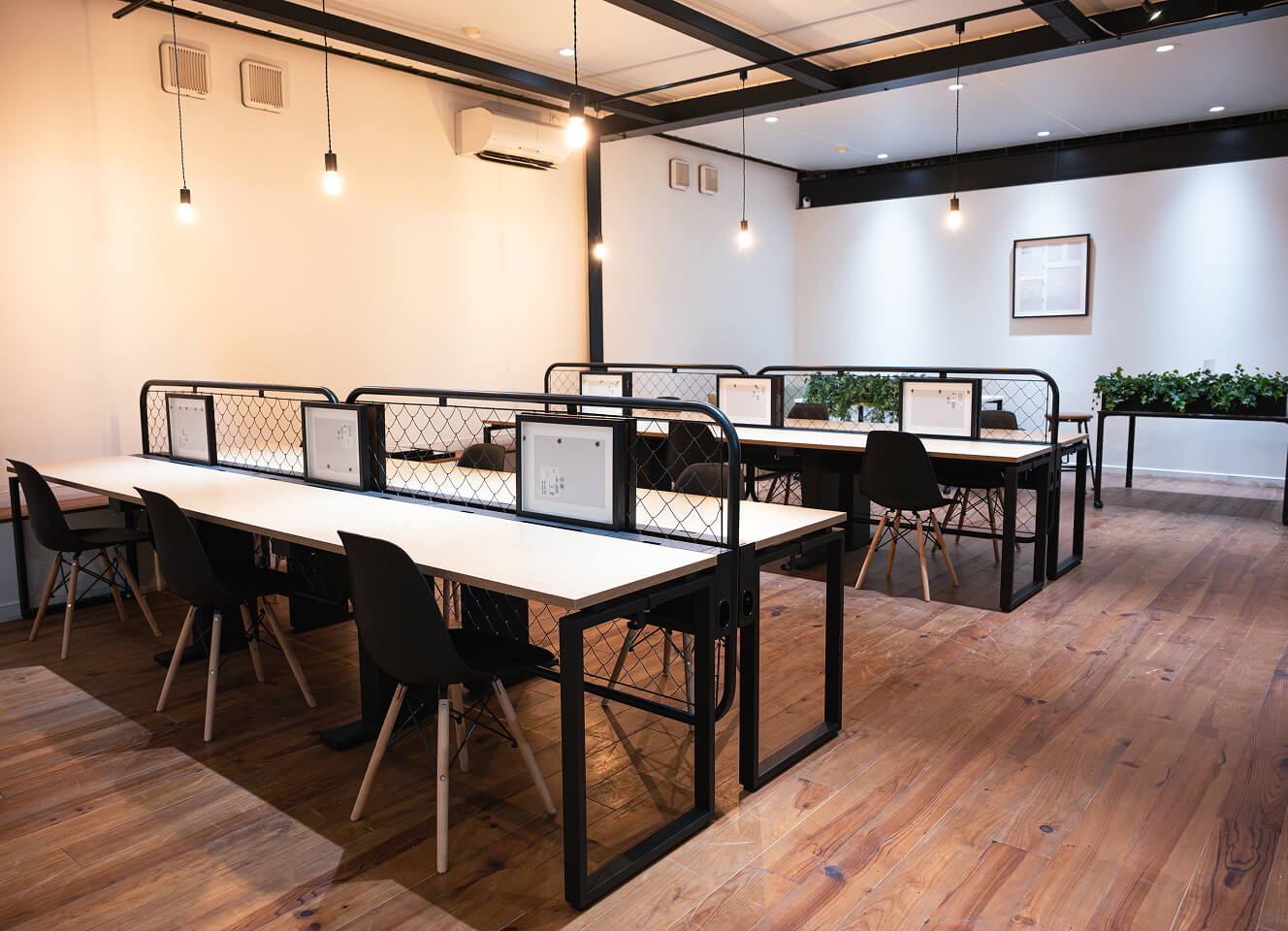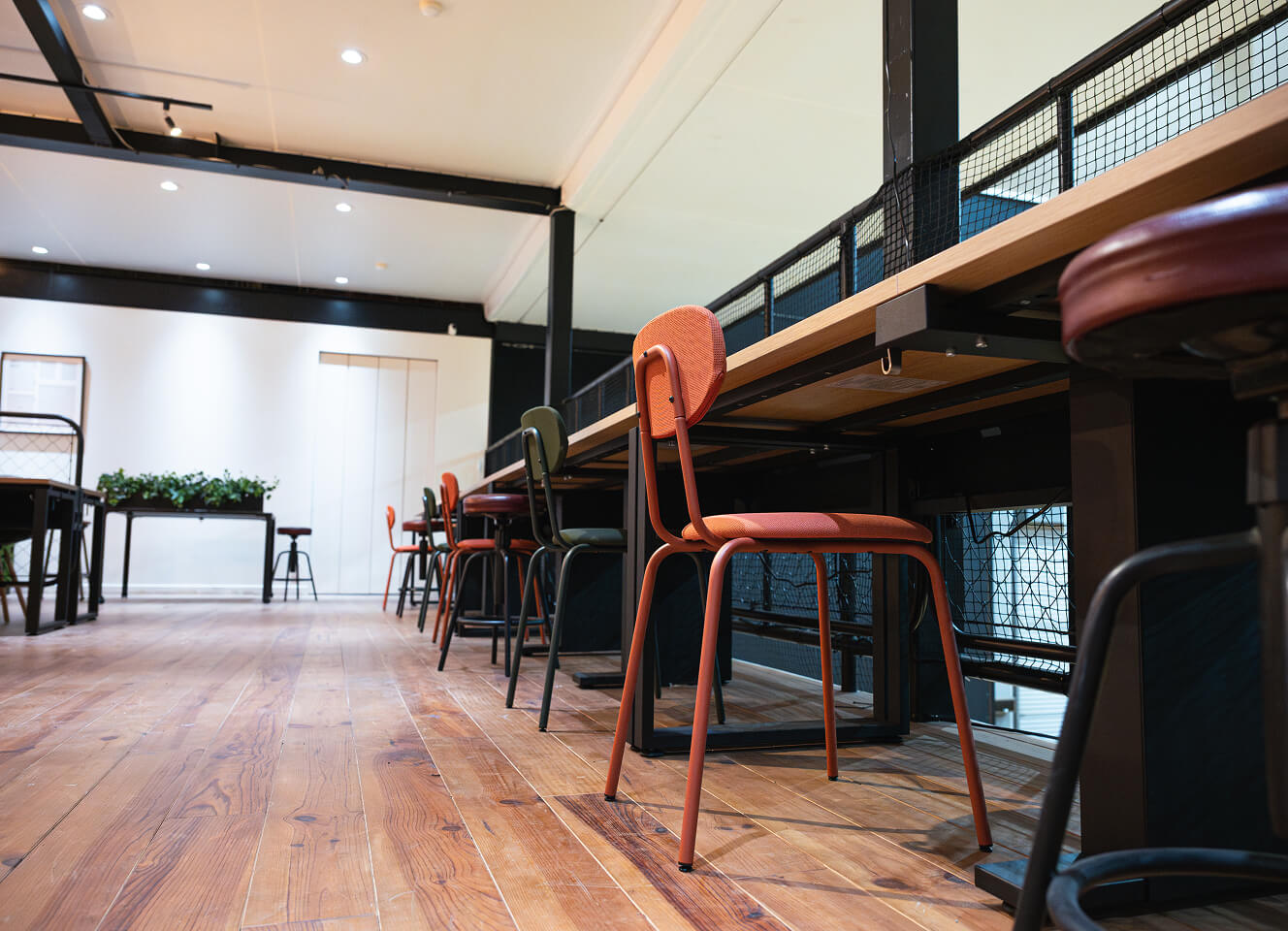 コートから階段を上がった2Fにはコワーキングスペースがあります。仕事や勉強など、ご自由にお使いください。